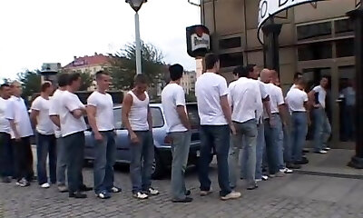 Twenty guys pounding this brunette slut